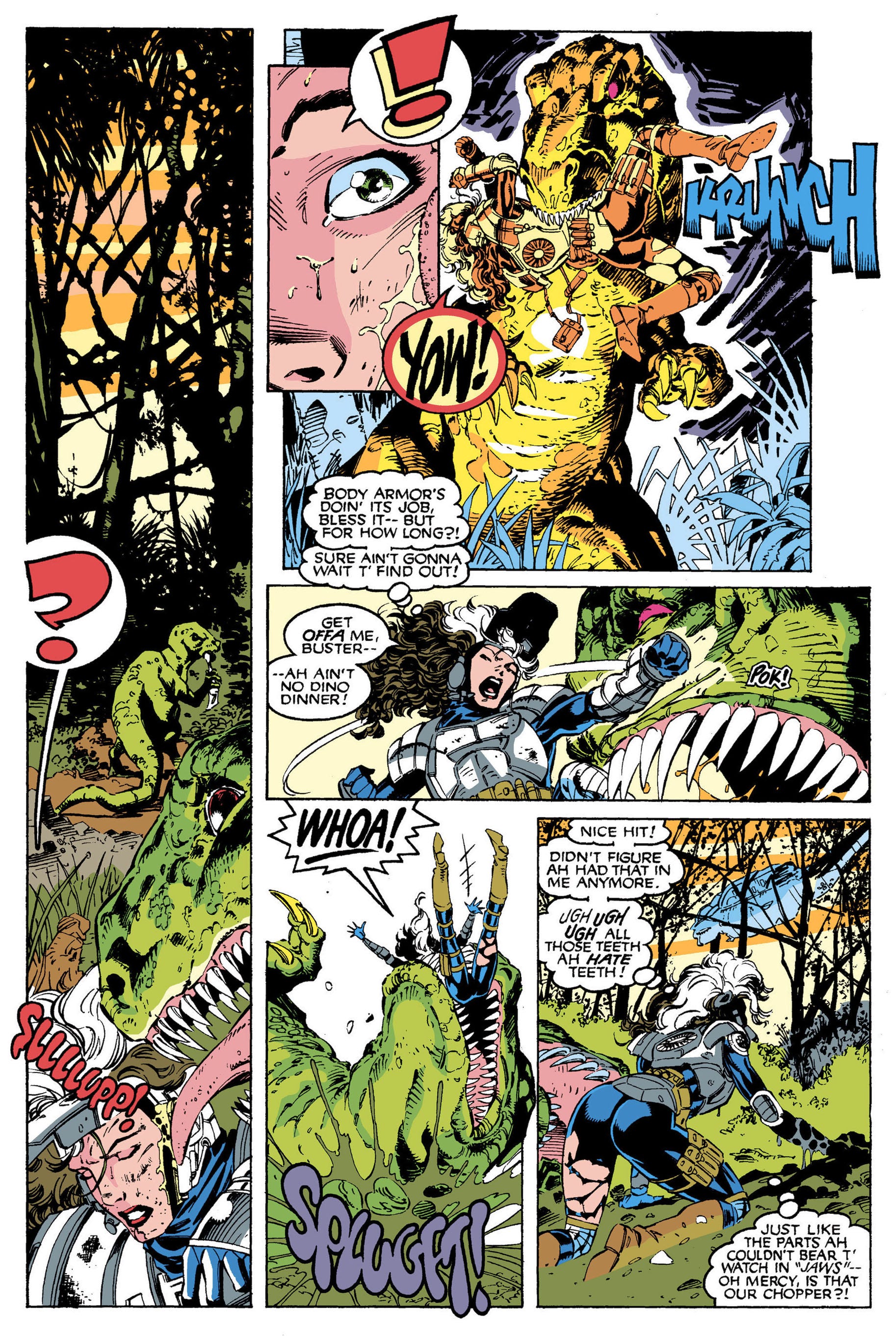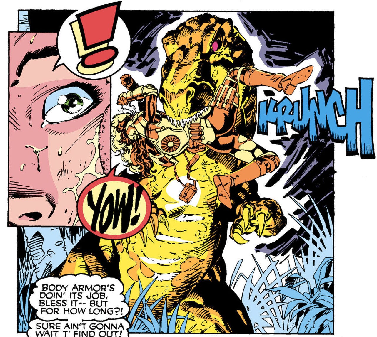 Notice how the yellow and blue KRUNCH panel stands out even though the palette choice isn't 'real'? If that panel was colored like others on the page (with a green T-Rex) it would be way less potent.