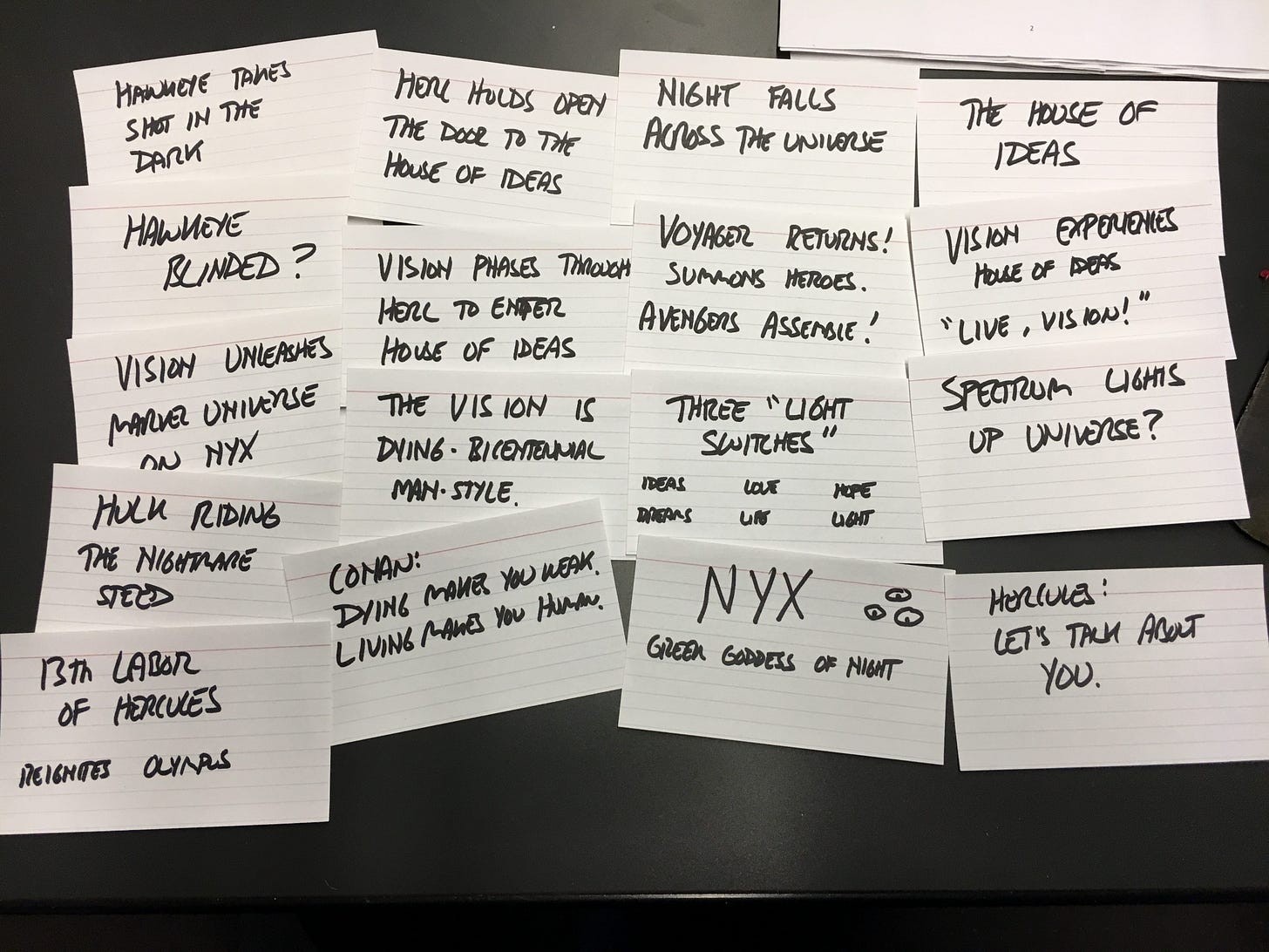As we brainstormed set pieces and ideas, Tom would jot good ones down on notecards so we could easily swap pieces in or out and figure out the overall structure of the story:
