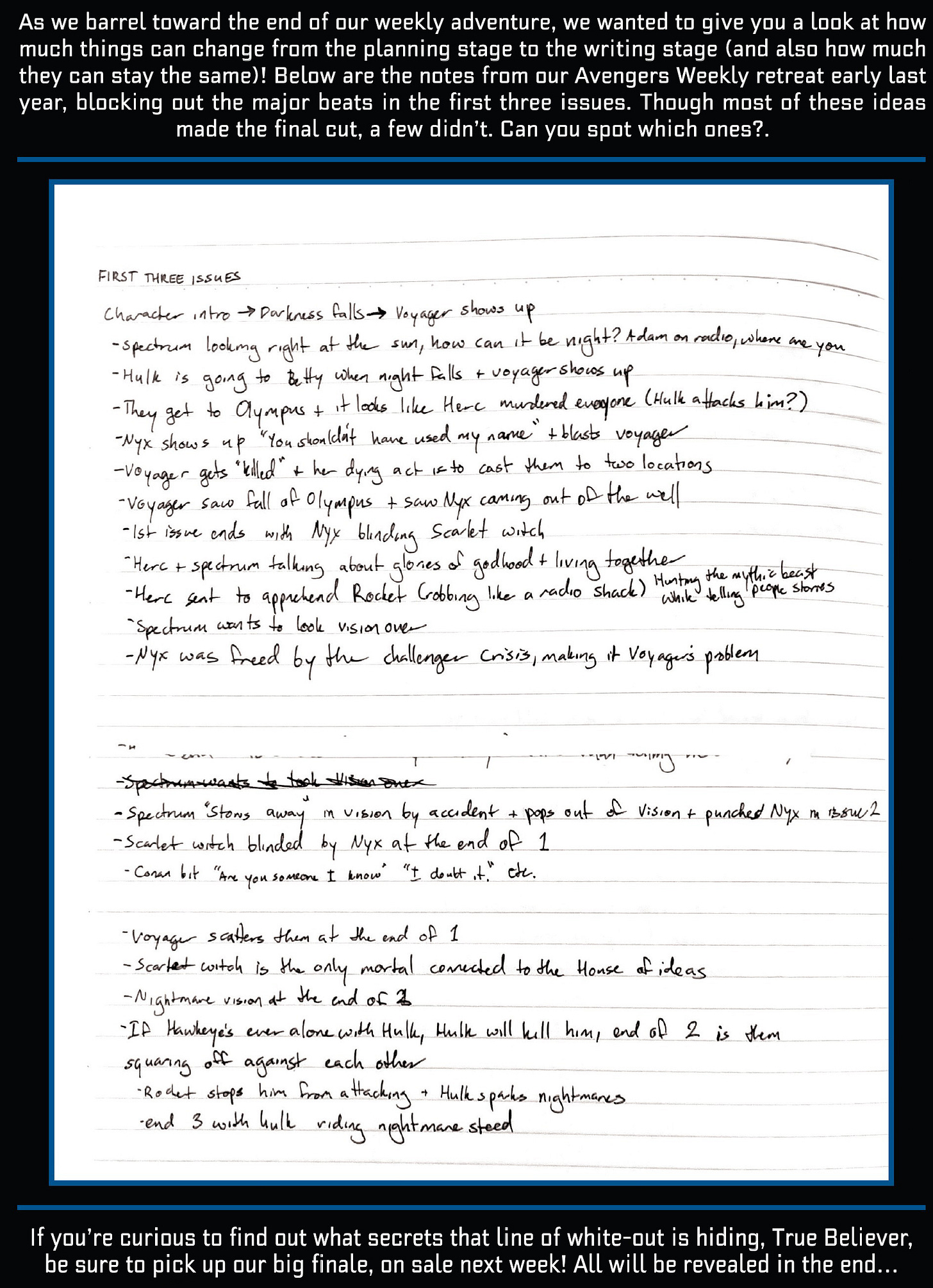 At the same time, Alanna Smith (assistant editor at the time, now full-fledged Marvel editor) wrote down bullet points to help us remember other bits and pieces that came up in discussion, leading to a back matter page in Avengers: No Road Home #9 that still creates a little ripple in Marvel fandom to this day-
